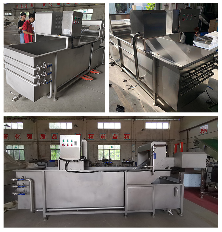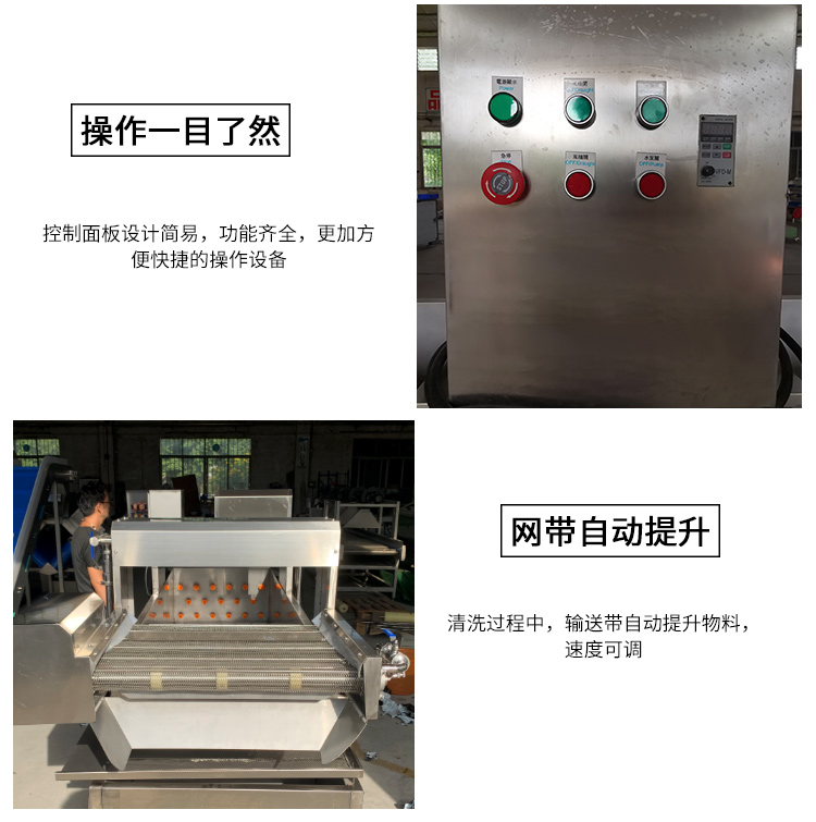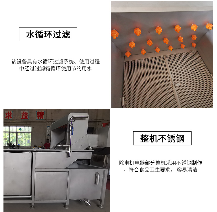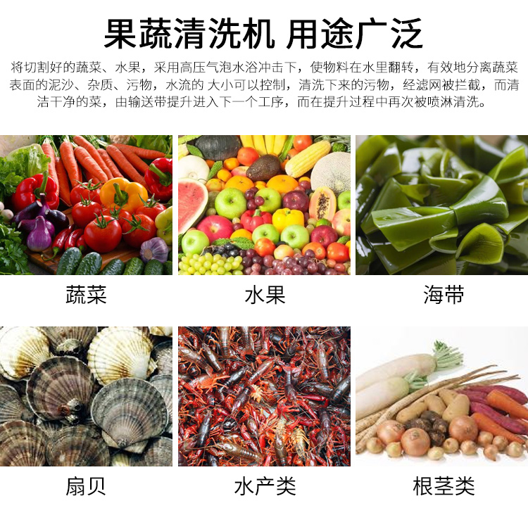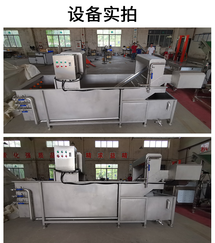 將切割好的蔬菜、水果,采用高壓氣泡水浴沖擊下,使物料在水里翻轉(zhuǎn),有效地分離蔬菜表面的泥沙、雜質(zhì)、污物,水流的大小可以控制,清洗下來的污物,經(jīng)濾網(wǎng)被攔截,而清潔干凈的菜,由輸送帶提升進入下一個工序,而在提升過程中再次被噴淋清洗。