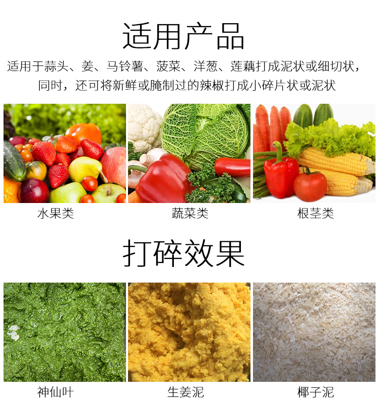 祥九瑞盈打碎機(jī)可將蒜頭、姜、馬鈴薯、菠菜、洋蔥、蓮藕打成泥狀或細(xì)切狀,同時,還可將新鮮或腌制過的辣椒打成小碎片狀或泥狀。